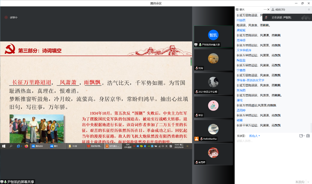 学子的别样风采。在诗词填空环节,各位选手你追我赶、毫不相让的样子仿佛在向世人宣告外院学子并不只专精于外语,在诗词方面也是一把好手。而最后一个环节的观看视频填空竞赛中,选手们毫不退缩,不停将自己的答案展现在聊天框中,将现场紧张激烈、精彩纷呈的气氛推向最高潮。