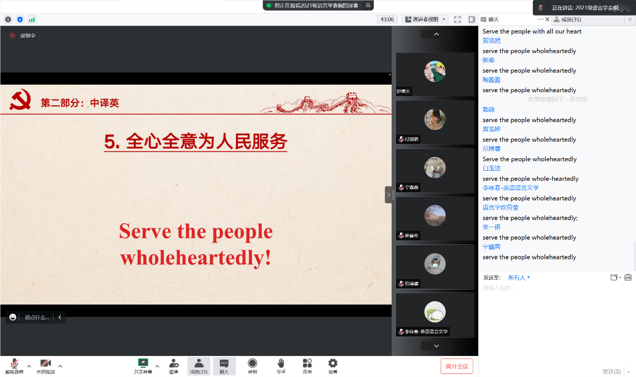 本次党史知识竞赛共分为单选题、中英党史热词翻译、诗词填空与观看视频填空四个环节。在第一环节的单选题竞赛中,同学们准备充分、热情高涨,回答问题争分夺秒、反应迅速,展现出扎实过硬的基本功。在中英党史热词翻译环节中,参赛同学的党史知识基础与扎实的专业水平相结合,向我们展示了新时代跳蛋视频