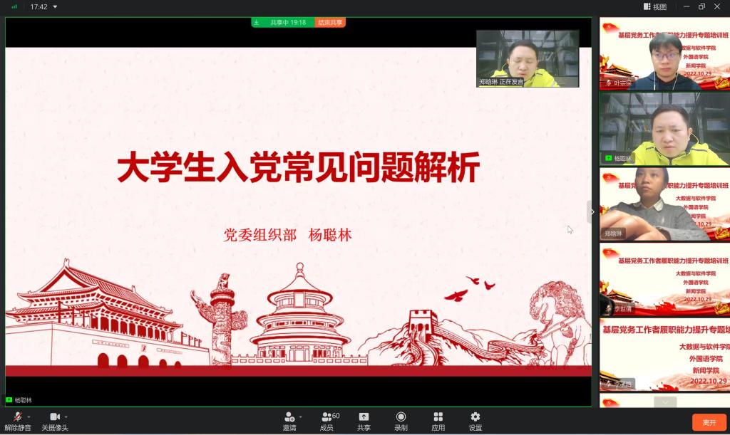 、大数据与软件学院和新闻学院采用线上会议的方式联合开展了“基层党务工作者履职能力提升专题培训班”第二讲。会议由大数据与软件学院党委组织员郑晗琳主持,来自大数据与软件学院、跳蛋视频