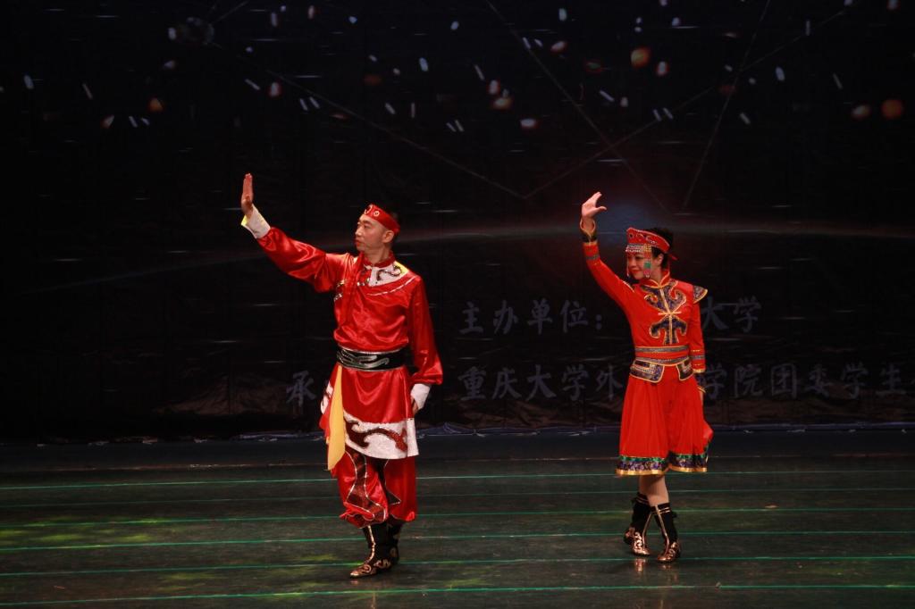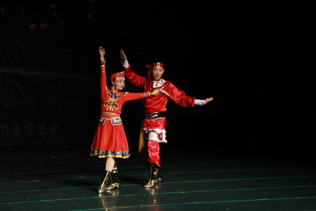 第十个节目蒙古舞《鸿雁》,由我院大学英语文理课程组的张津玮老师和德语系的吴娟老师表演。他们褪去课堂上的严肃,带着动人的浅笑,迈着沉稳的舞步,双手似雁,在舞台上勾勒出草原天空的意蕴。曲止舞终,小剧场里传来同学们的阵阵欢呼声。