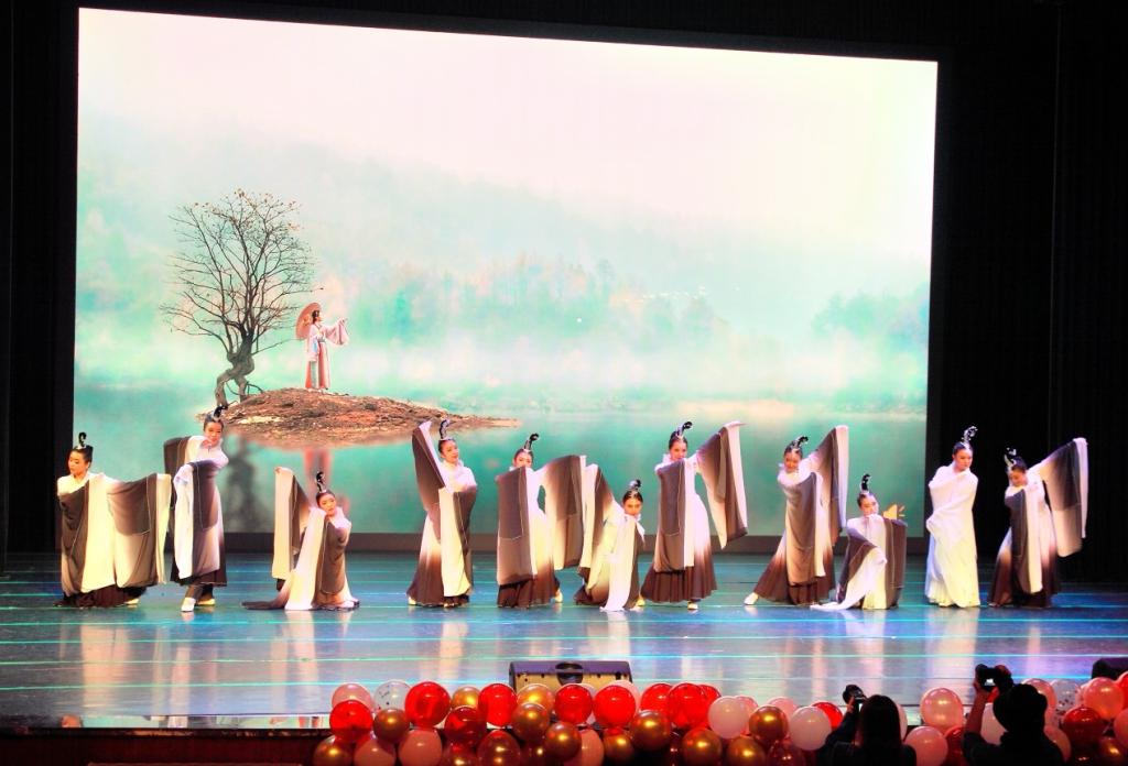 校工会教职工舞蹈协会的11名成员历时三个多月的辛苦训练和打磨,在我院工会文体委员、德语系老师吴娟的带领下,完美呈现了以诗经为创作素材的女子古典群舞《白纻舞•在水一方》,塑造了行走在水边的江南女子的艺术形象,获得了在场师生观众的热烈掌声和广泛好评。