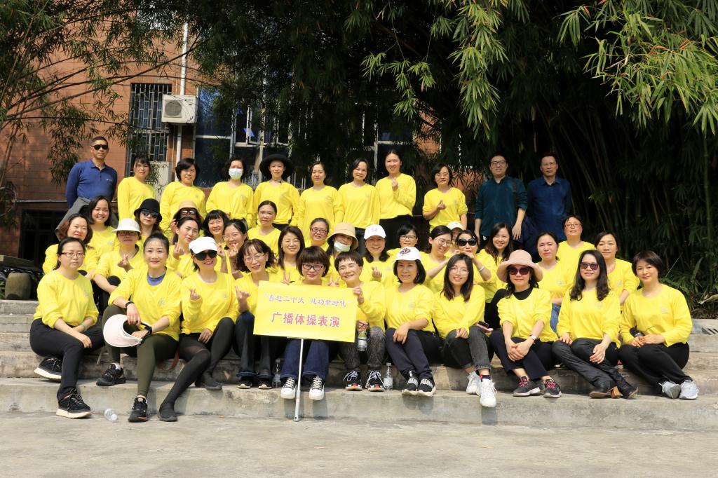 广播体操表演以分工会为单位,分为四个方阵参加。中午13:20,沐浴着温暖的阳光,参加广播体操比赛的老师们提前来到思群广场领取统一服装,站队训练。14:00,随着“全国第九套广播体操”的音乐响起,老师们昂首挺胸,开始表演。运动场上大家精神饱满,动作整齐,张弛有度,充盈着刚健之美,充分展示了跳蛋视频