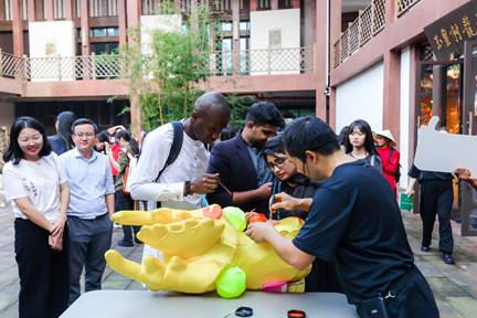 中午时分,国际学生在品尝当地特色美食后,游览打卡“中国第四大古城”全国非遗旅游景区——安居古城。国际学生走在街道小巷中欣赏着安居古城造型各异的中式特色房屋建筑,在近距离观看川剧“变脸”中感受中国艺术瑰宝之奇,在铜梁龙舞的惊艳表演中感叹精湛多彩的艺术特色。