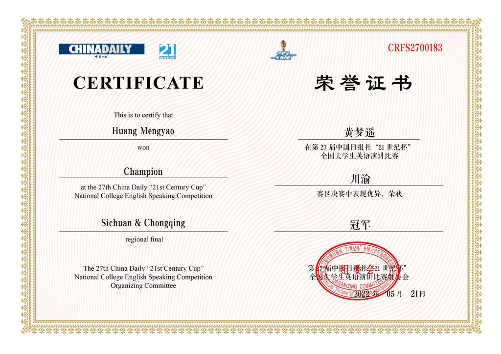 2019级英语专业本科生黄梦遥摘得桂冠,本科生院2021级电气与信息大类本科生邹雨吟荣获二等奖。根据大赛赛制规则,黄梦遥将代表川渝地区角逐国赛。