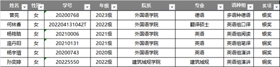 6位选手分别从重庆赛区演讲、阅读、口译、笔译、多语种德语等5个赛项中脱颖而出晋级国赛,3人获得全国银奖,3人获得全国铜奖。