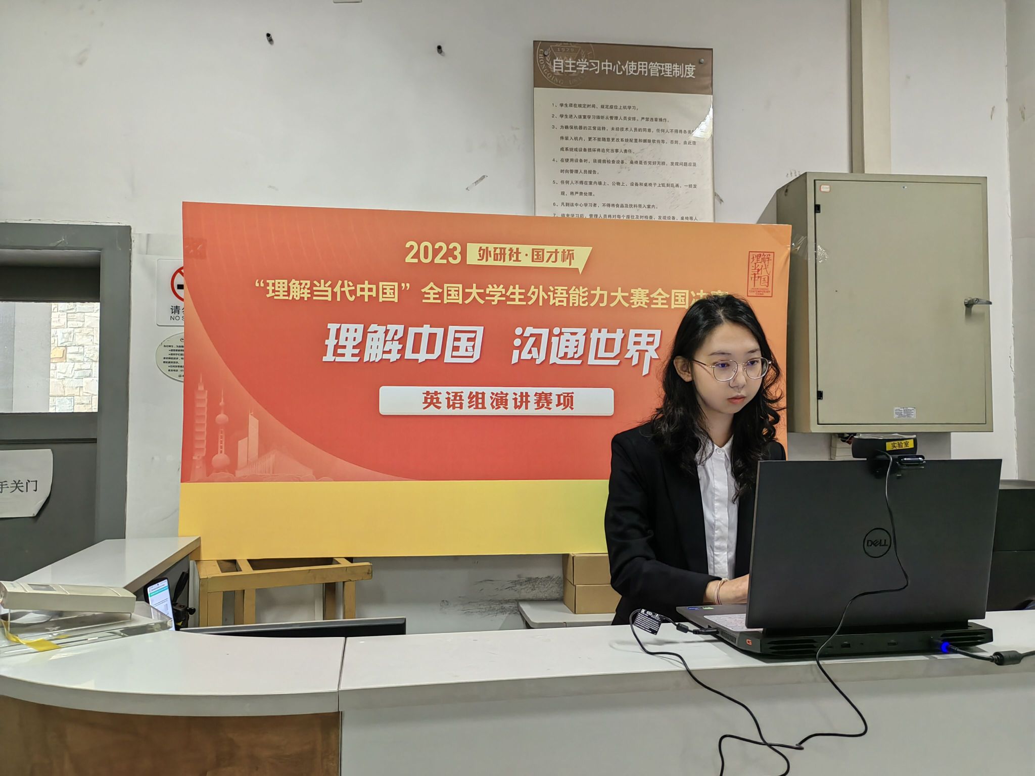 翻译硕士何林香在强手如林的赛场中,凭借较强的信息处理能力和口译实战技巧突出重围晋级国赛第二阶段入围全国百强。在第二阶段中仍为英汉交替传译,包含欧元区通胀情况、人工职能发展内容等考点。何林香以稳定的临场反应,较强的心理素质完成比赛,展现出较好的国际传播素养,并赢得赛项银奖。