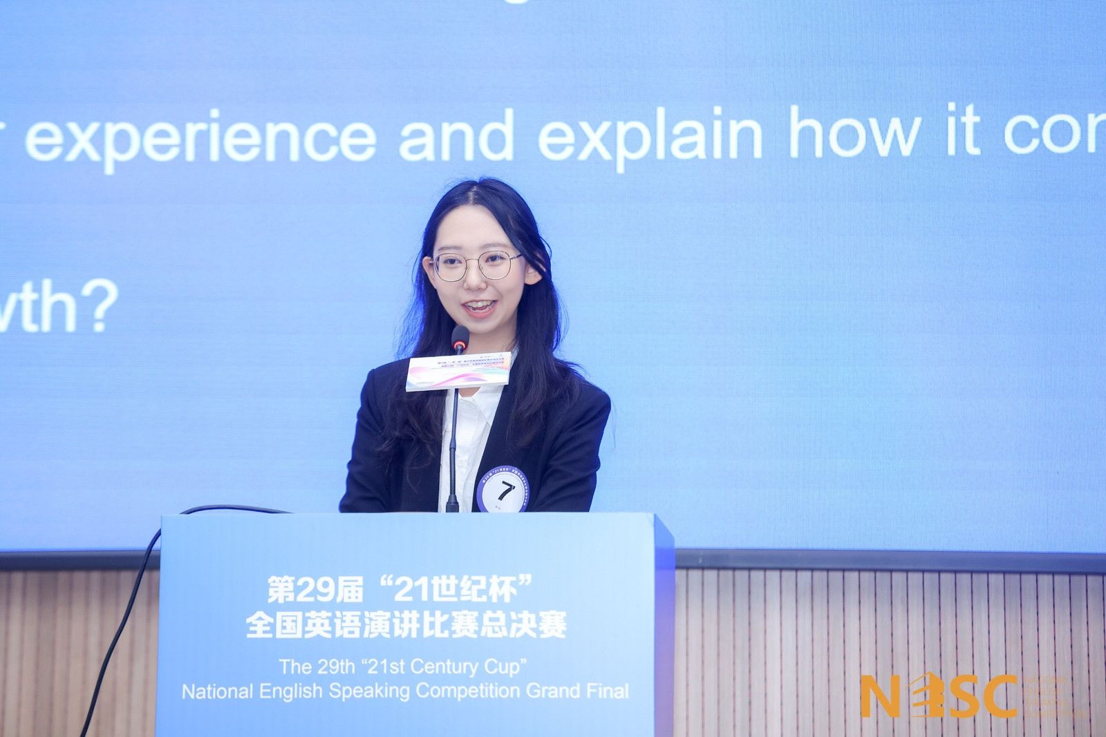 比赛分为半决赛、总决赛两赛程。半决赛第一轮涵盖定题演讲和即席演讲两个环节。孙奕婷聚焦定题演讲主题“The revival of traditional culture”,以个人经历切入,以小见大,畅言科技助力文化传播的重要作用;又将自身曲折比赛经历与即兴演讲题目结合,论述要敢于尝试、勇于创新来实现自我突破。在这两个环节,她发挥从容自若,顺利晋级半决赛第二轮。