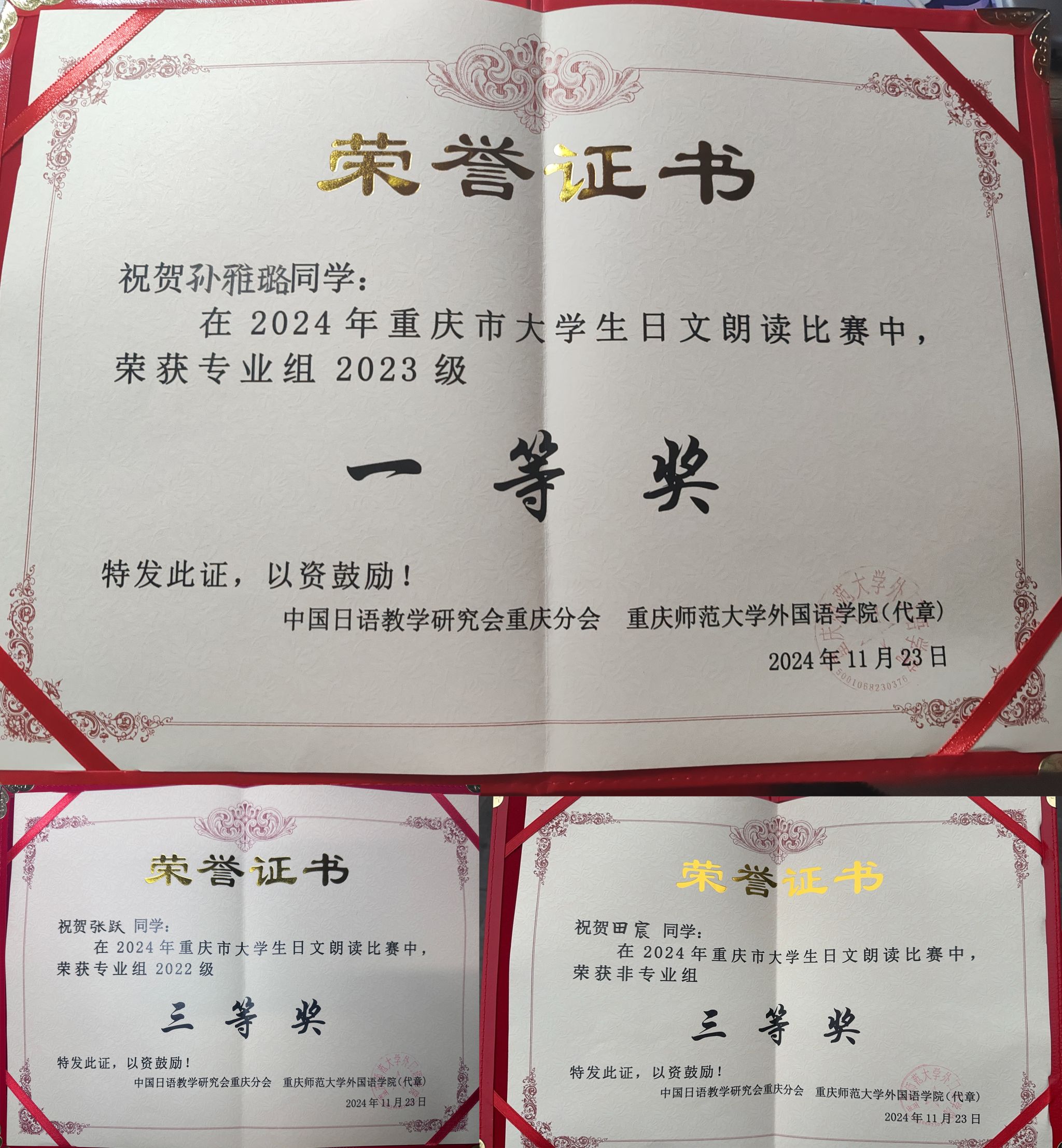 三名同学取得了优异的成绩。其中,日语专业孙雅璐同学获专业组2023级一等奖,日语专业张跃同学获专业组2022级三等奖,2022级微电子与通信工程学院电子信息工程专业本科生田宸同学获非专业组三等奖。