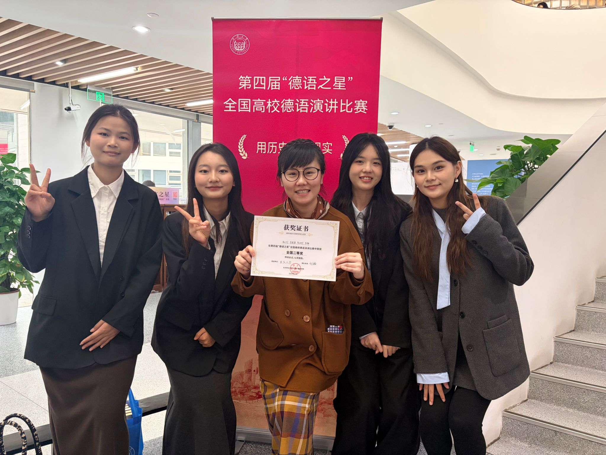 德语专业代表队凭借深刻的主题阐释、精湛的德语表达与出色的临场应变,从全国15支晋级队伍中脱颖而出,最终斩获全国二等奖,指导老师向璐荣获“优秀指导教师奖”。