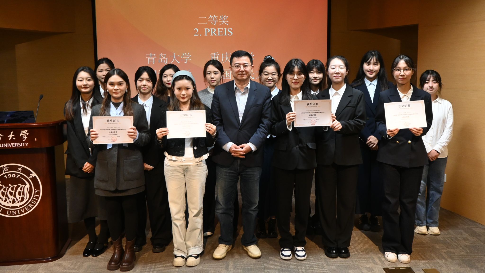 在向璐老师指导下,团队分工协作,赵子宁、李圆圆搭建框架并撰写讲稿,苏静、陈柯宇负责资料收集与PPT制作。比赛中,赵子宁以沉稳台风和流畅德语完成演讲,提问环节四位选手沉着应对、对答如流,展现出扎实的专业功底与深度思考,赢得评委一致认可。