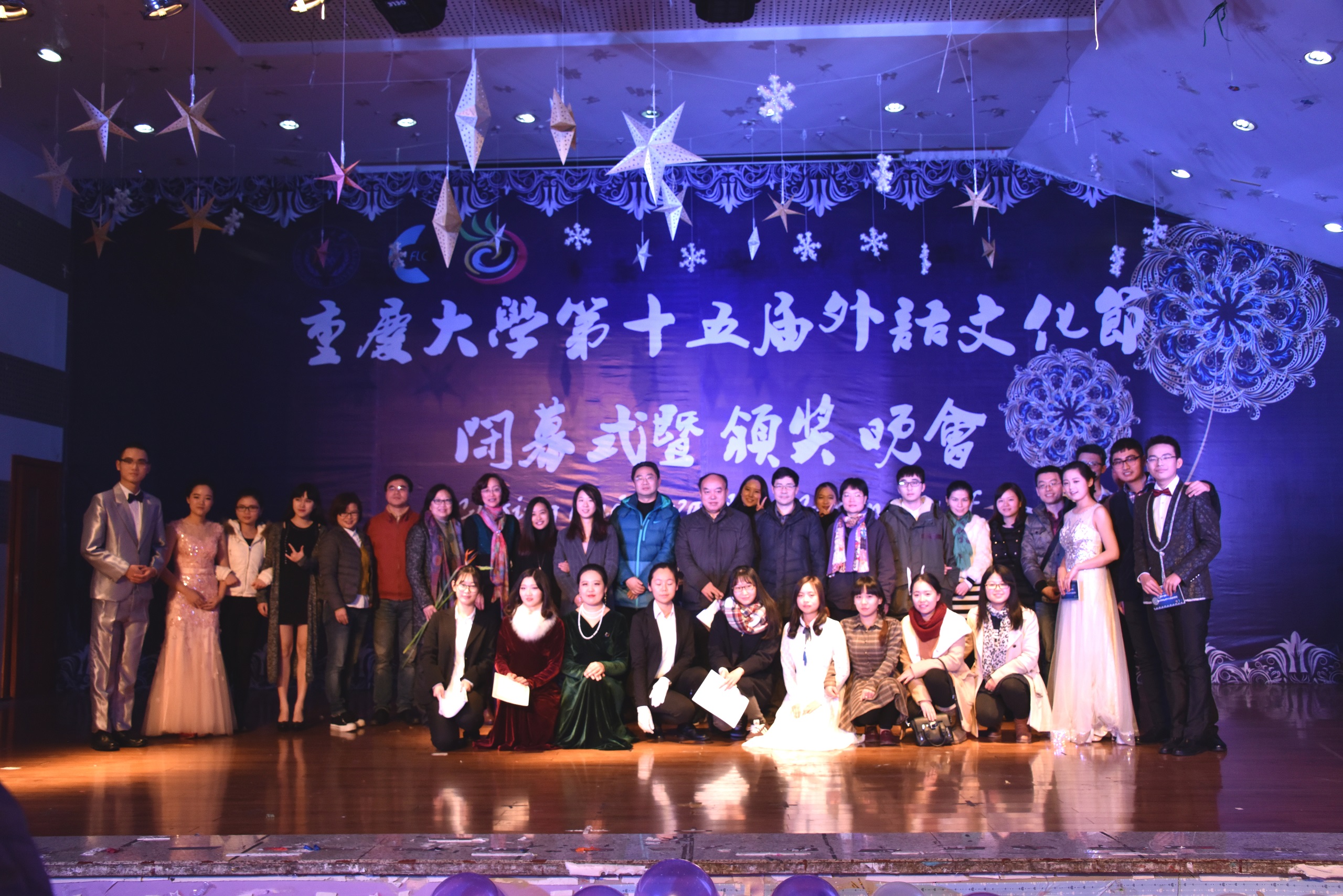 国际处科长刘郢老师;虎溪校区党工委副书记出席、学工办主任王宇红老师;沙坪坝区烟草专卖局副局长江山先生;重庆服务贸易协会研究咨询部部长唐笑水女士;新东方重庆总部国外考试部招聘主管雷婧女士,以及外院全体同学应邀参加晚会。
