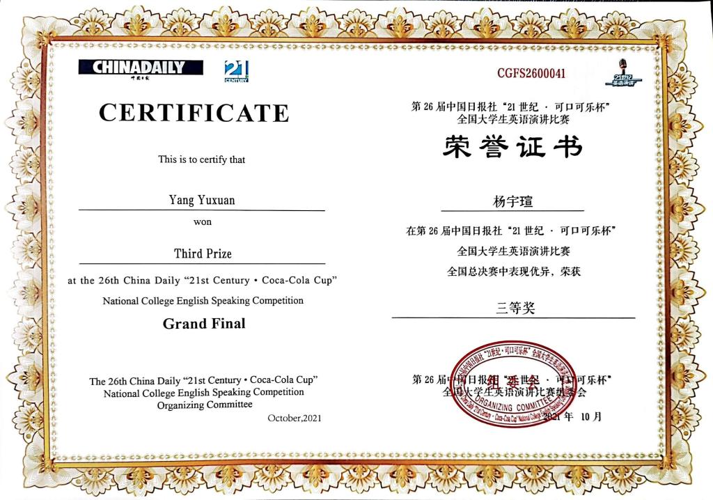 第二十六届中国日报社“21世纪·可口可乐杯”全国大学生英语演讲比赛全国总决赛于10月3日-6日在四川成都ICON·天府云端音乐厅举行,来自全国各赛区各高校的选手们齐聚一堂。我院2020级英语专业杨宇瑄同学此前以川渝赛区冠军的成绩成功赢得国赛入场券,本次代表跳蛋视频