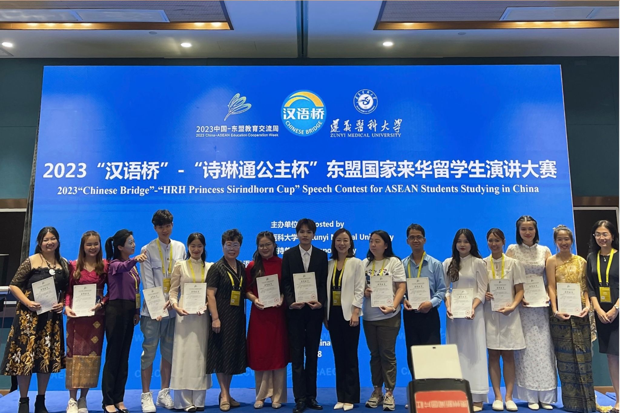 2023年8月28日,遵义医科大学主办的2023中国-东盟教育交流周开幕式活动“汉语桥”——“诗琳通公主杯”东盟来华留学生演讲大赛暨“访黔北文化,桥见遵医”研学之旅在贵州贵阳正式开幕。本次比赛以“我的中国情缘”为主题,讲述留学生们在中国留学期间的所见、所思和所感。我院由雷雨老师指导的汉语国际教育专业研二的泰国留学生王文山参加比赛并获得三等奖。
