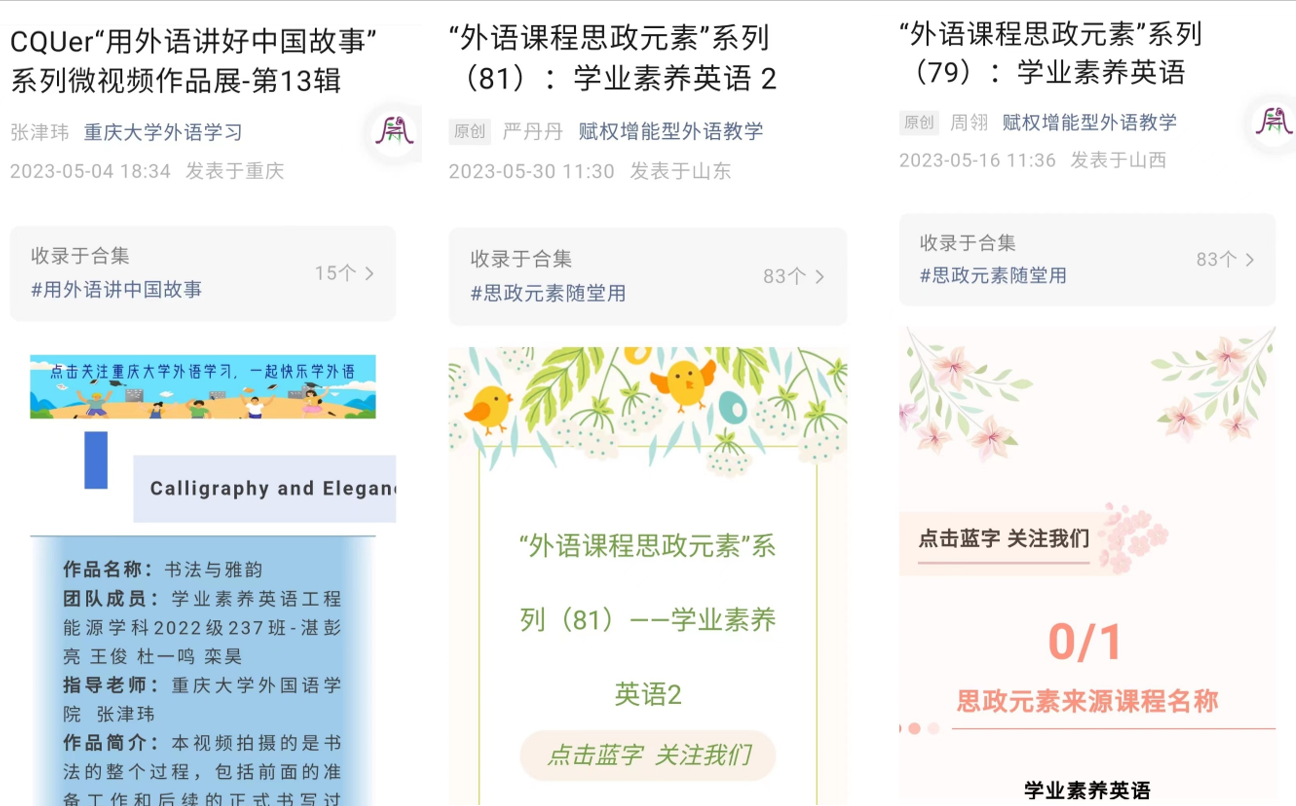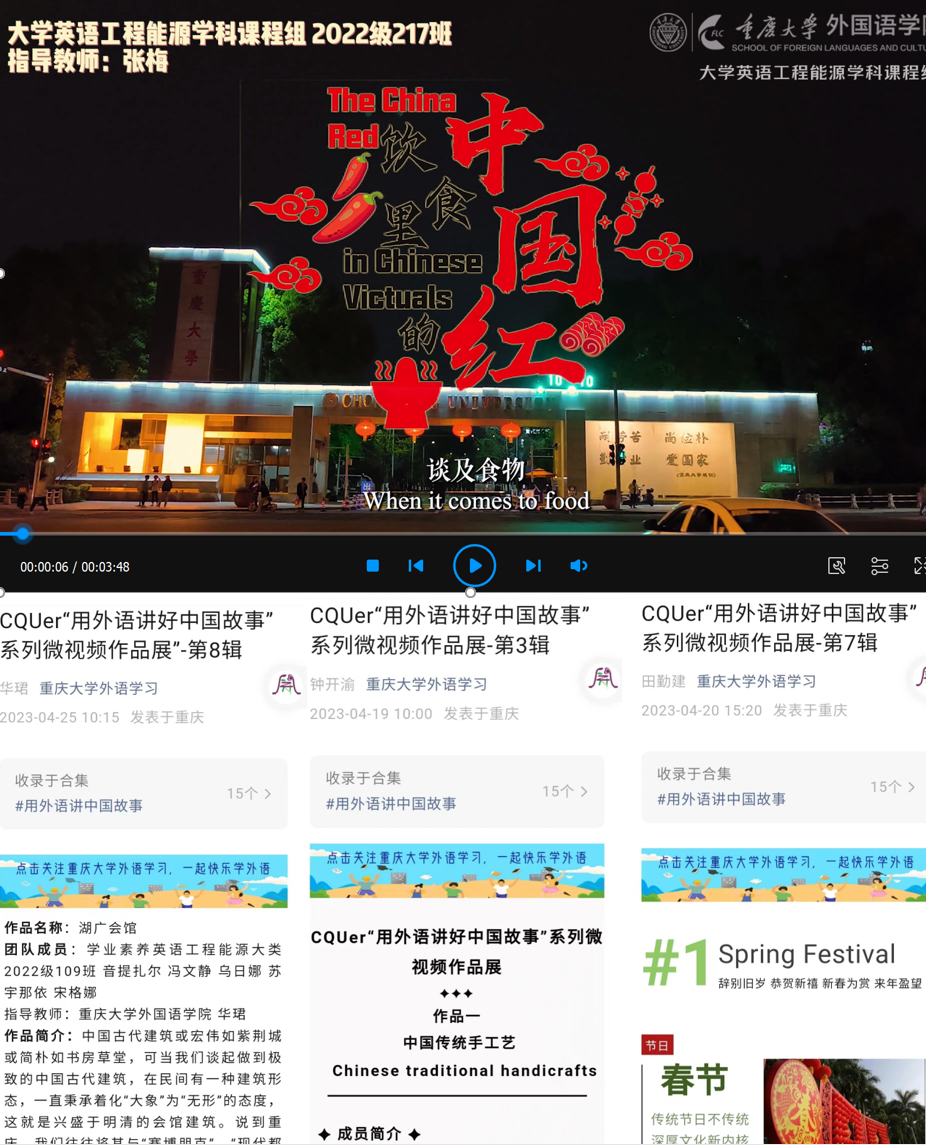 的官方微信重大外语学习公众号上,迄今已发布15辑,让更多人共鉴互评重大学子的外语思政教学实践。此次大赛短视频活动的成功开展,进一步弘扬了中华传统文化,增强了同学们的文化自信和民族自豪感,提升了学生的外语能力、视觉素养、团队合作能力等综合素养和实践能力。