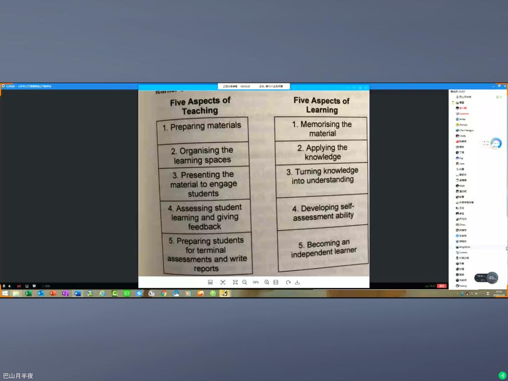 全组老师分享结束后,专家进行了及时的答疑互动,通过此次研讨,老师们更加深刻的理解了在线教学的历史背景,以及信息技术进课堂的必然性和必要性,同时也借此机会反思教学设计,线上教学并非简单的将课件分享给学生,而是要对教学内容、教学形式、教学模式、教学评估进行全方面重构。余渭深教授最后提出对我院外语教师的四个期待:一、期望教师们更能加熟练的掌握现代信息技术,迎接第四次教育革命;二、课堂技术与学生的生活技术相连接,将学生的学习融入生活,让学习有真实感、意义感;三、课堂互动的形式需要更加多元,注重文本互动,让技术打破班级界限;四、注重培养学生的语言意识和语言能力,回归语言教学之本。