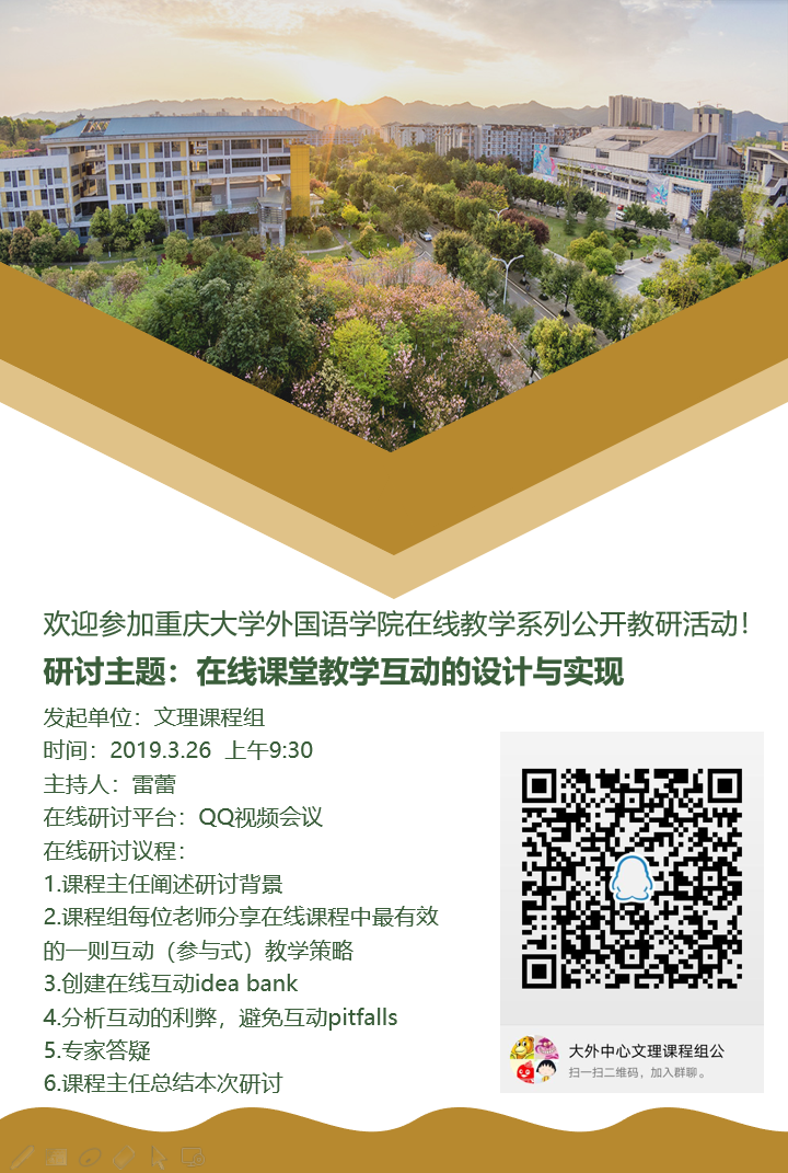 2020年3月26日上午9:30-12:00,我院大学外语教育中心文理课程组通过QQ视频电话举行了在线教学公开教研活动。本次活动由课程主任雷蕾老师主持,学院院长彭静、书记欧玲、教学副院长李小辉、院教学督导委员会教授以及我院大学外语教育中心各课程组教师等53人参加了此次活动。